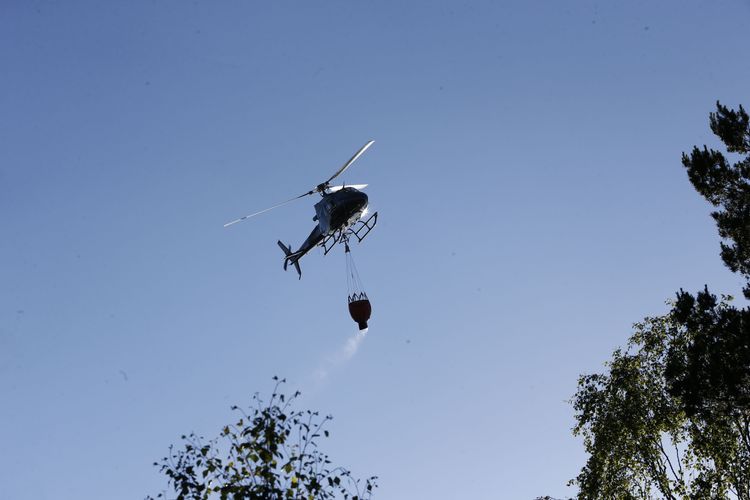 Två helikoptrar arbetade med att släcka branden men insatsen avslutades på kvällen. Räddningstjänsten uppgav att skogsägare har egen personal på plats under natten.