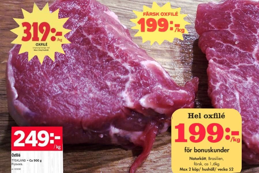 De två kedjor som har med svensk oxfilé i sina annonsblad är Ica Kvantum och City Gross. I deras kampanjer kostar den svenska filén drygt trehundra kronor per kilo.